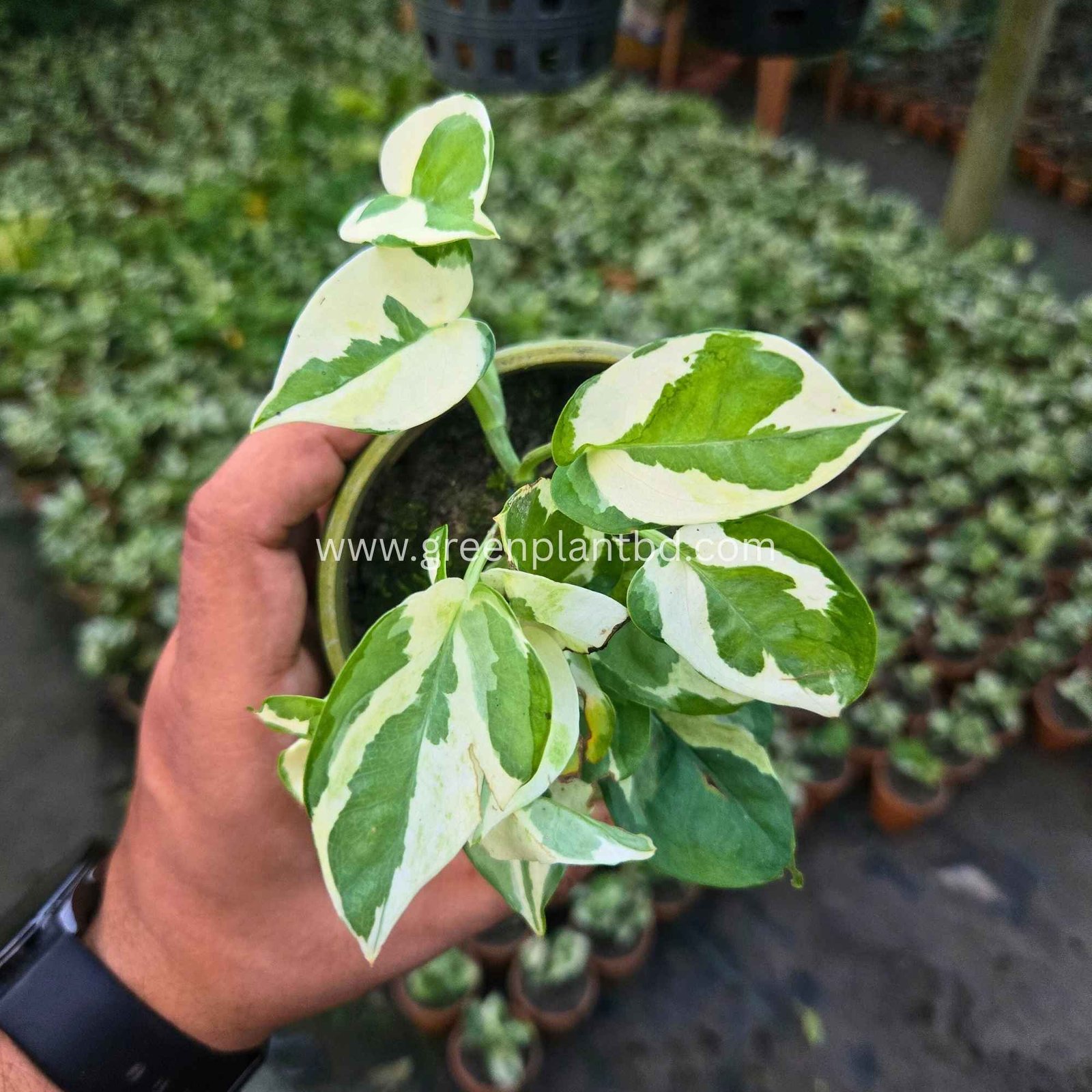 The plant in the image is the ‘N’Joy Pothos’ (Epipremnum aureum ‘N’Joy’), known for its distinct white and green leaves.